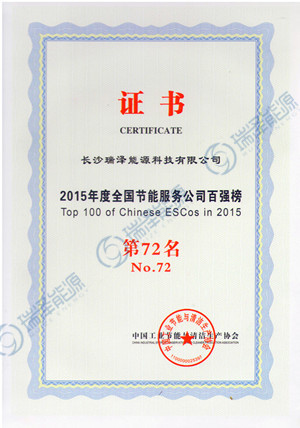 在近日舉辦的“中國節(jié)能服務(wù)產(chǎn)業(yè)發(fā)展論壇暨2015中國節(jié)能服務(wù)公司百強榜發(fā)布會”上,中國工業(yè)節(jié)能與清潔生產(chǎn)協(xié)會發(fā)布了2015年度中國節(jié)能服務(wù)公司百強榜榜單及研究報告。長沙瑞澤能源科技有限公司榮登百強榜單。