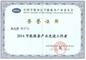 在中國(guó)節(jié)能協(xié)會(huì)節(jié)能服務(wù)產(chǎn)業(yè)委員會(huì)(EMCA)開展的2014年度節(jié)能服務(wù)產(chǎn)業(yè)評(píng)優(yōu)活動(dòng)中,我公司總經(jīng)理榮獲2014年度節(jié)能服務(wù)產(chǎn)業(yè)先進(jìn)工作者。